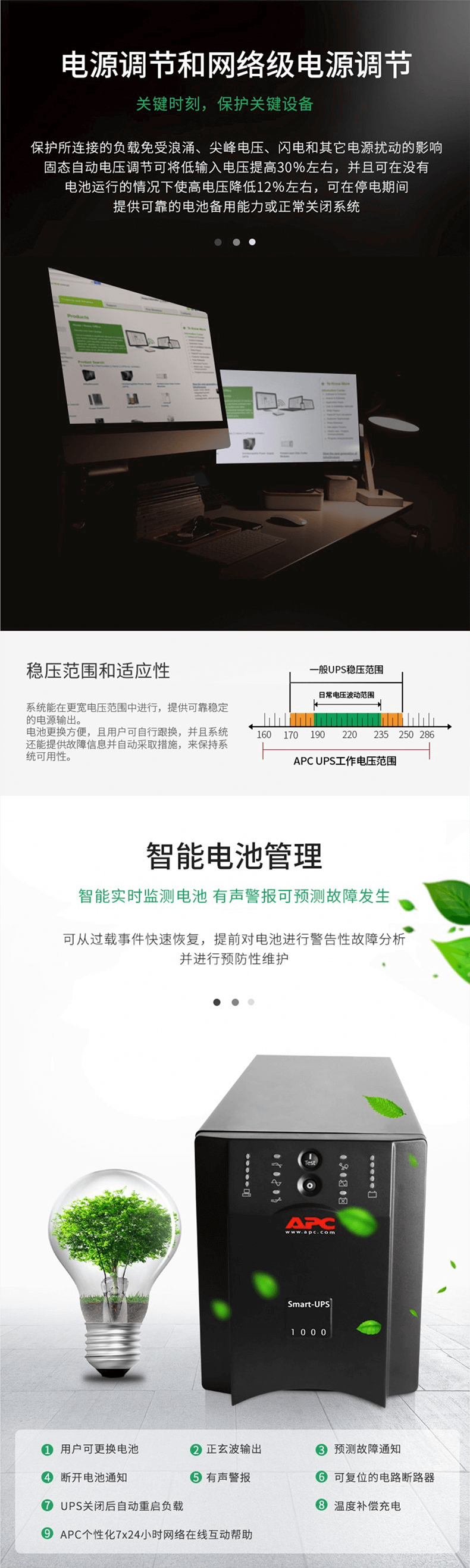 • 产品描述:APC公司的Smart-UPS,1000VA,USB和串口,230V,适用于中国。智能、高效的网络电源保护,从入门级到可扩展的运行时间。对于服务器、销售点终端设备、路由器、交换机、集线器和其它网络设备来说是理想的UPS。网络级电源调节功能可防止浪涌的危害和破坏性的噪音,直观的LCD界面提供了清楚的信息,并且可以通过易于使用的导航键在本地配置UPS,提供由采用有源功率因数校正(PF