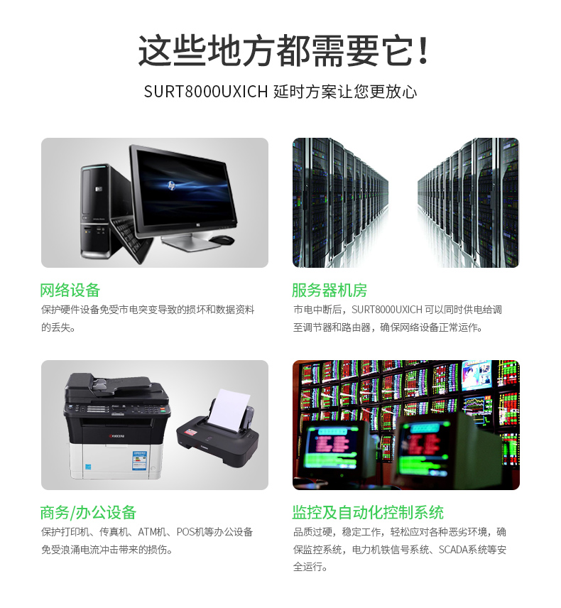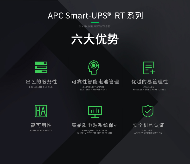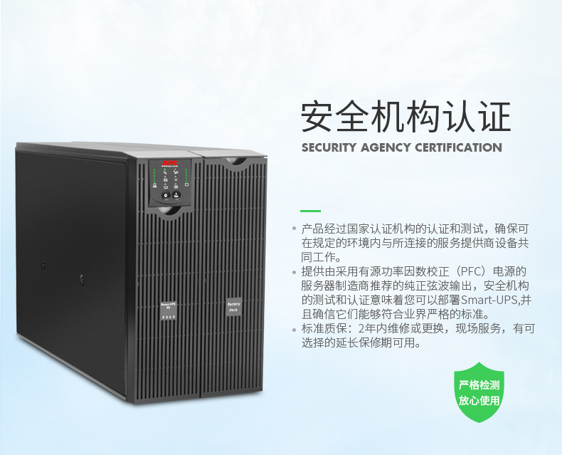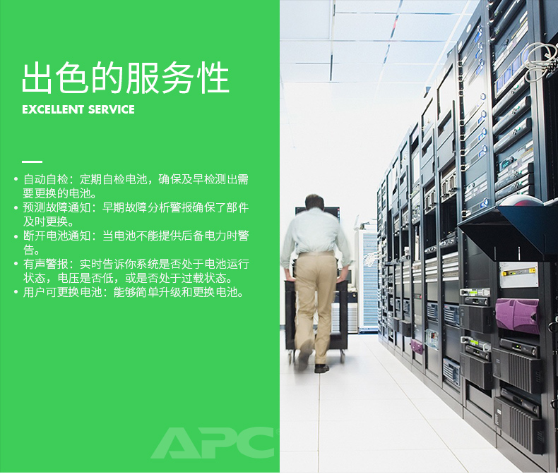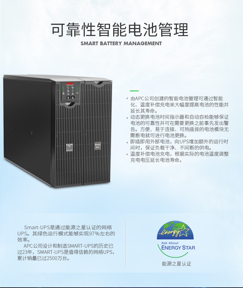 • 产品描述:APC公司的Smart-UPS RT,8000VA,380V/230V,适用于中国在可扩展的运行时间内提供高密度的双转换在线式电源保护。由APC公司首创的智能电池管理可通过智能化、精确的温度补偿充电来最大限度地提高电池的性能并延长其寿命。自动自检确保了电池的可靠性并可在更换电池前向用户发出警告。方便、易于连接、可热插拔的电池模块使得无需断电就能进行电池更换。网络级电源调节功能可