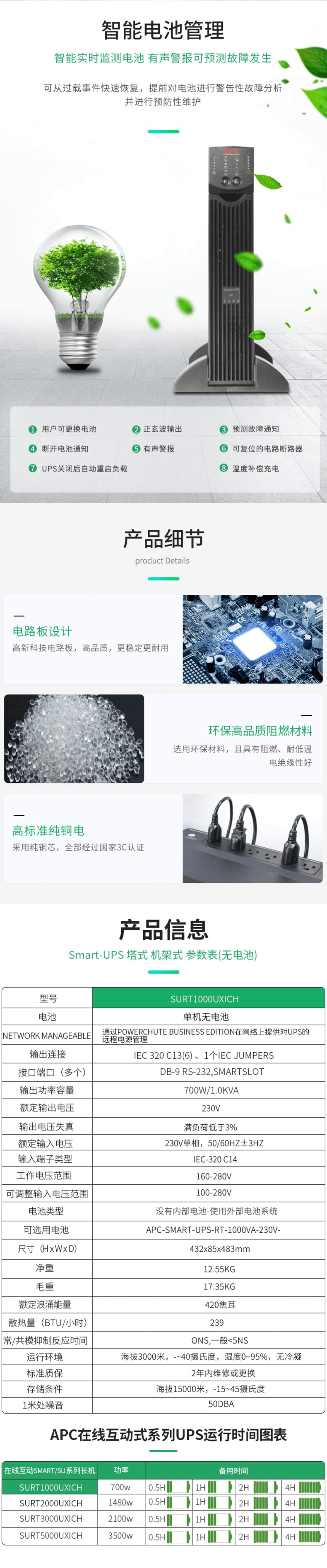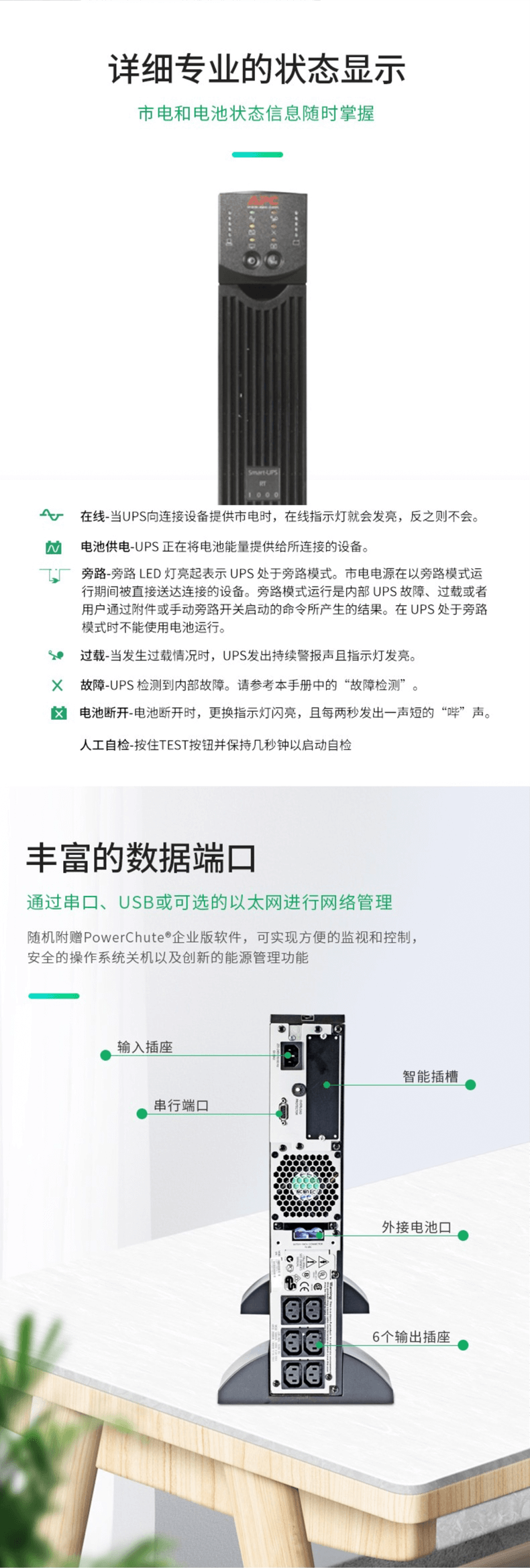 • 产品描述:APC Smart-SURT1000UXICH 1KVA/700W长机 机架/塔式灵活切换的在线式UPS电源2年质保,1000VA,230V。由APC公司首创的智能电池管理可通过智能化、精确的温度补偿充电来最大限度地提高电池的性能并延长其