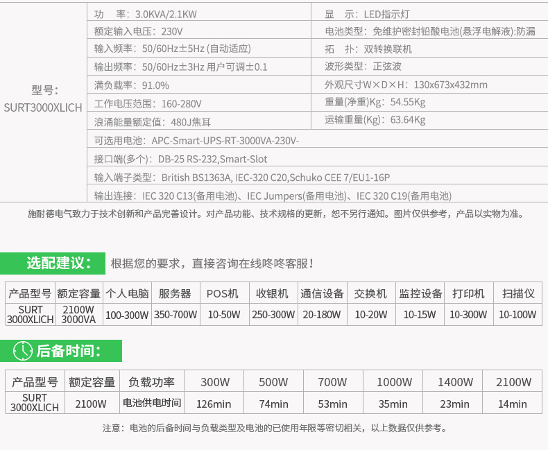 APC Smart-SURT3000XLICH 3KVA/2.1KW标机 机架/塔式在线式UPS电源2年质保