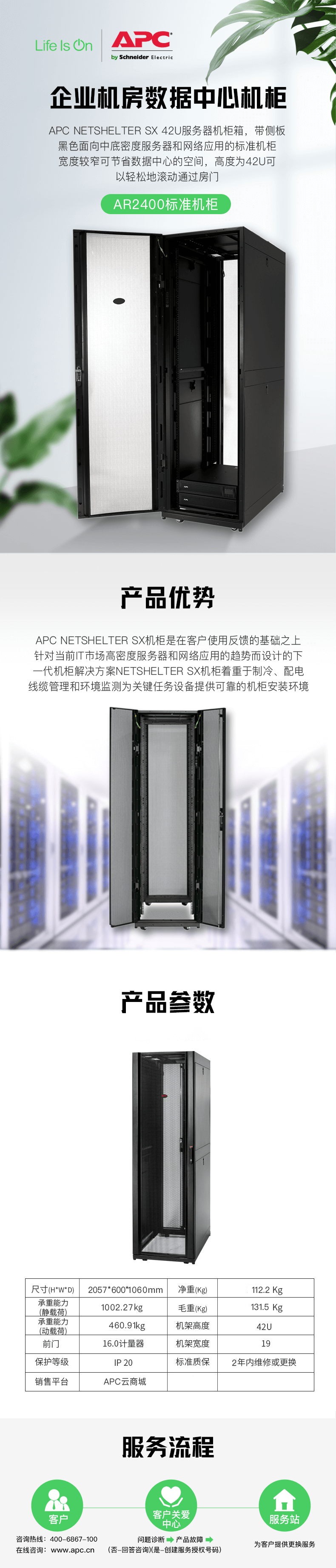 • 产品描述:APC推出的面向中低密度服务器和网络应用的标准机柜。宽度较窄,可节省数据中心的空间。高度为 42U/48U,可以轻松地滚动通过房门。与 APC InfraStruXure 产品集成;兼容目前所有主流的网络设备(IBM、DELL、HP、思科、联想、H3C、浪潮、EMC、华为等);适用范围:各种IT数据机房,配线间,IDC,云计算等机房;产地:国产