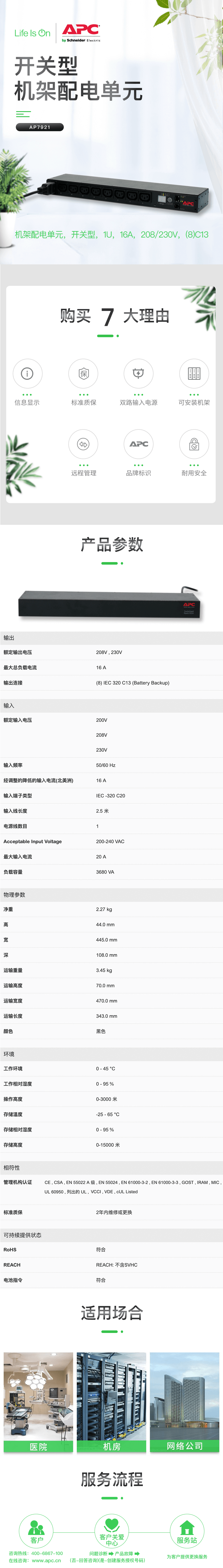 施耐德 APC Switched Rack PDU AP7921B 开关式机架配电单元