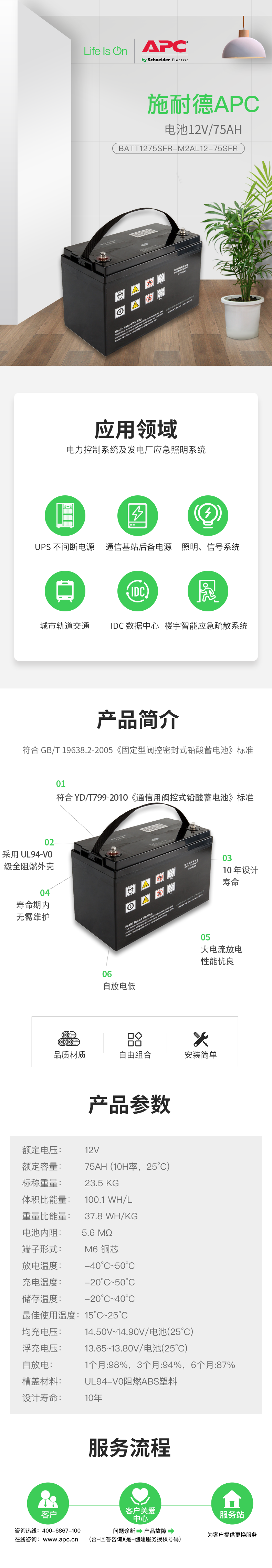 APC BATT1275SFR-M2AL12-75SFR 原厂12V 75AH铅酸免维护蓄电池 10年设计寿命 质保3年