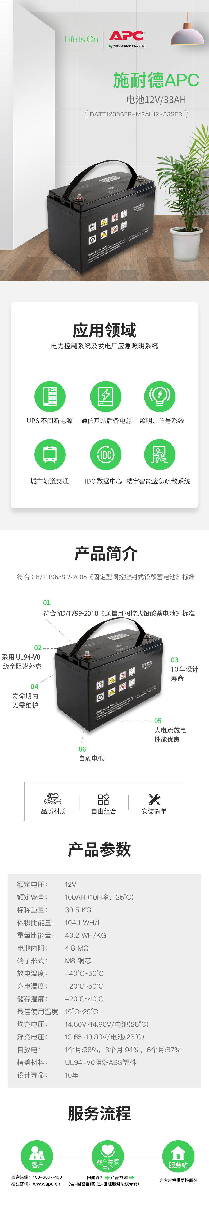 APC BATT1233SFR-M2AL12-33SFR 原厂12V 33AH铅酸免维护蓄电池 10年设计寿命 质保3年