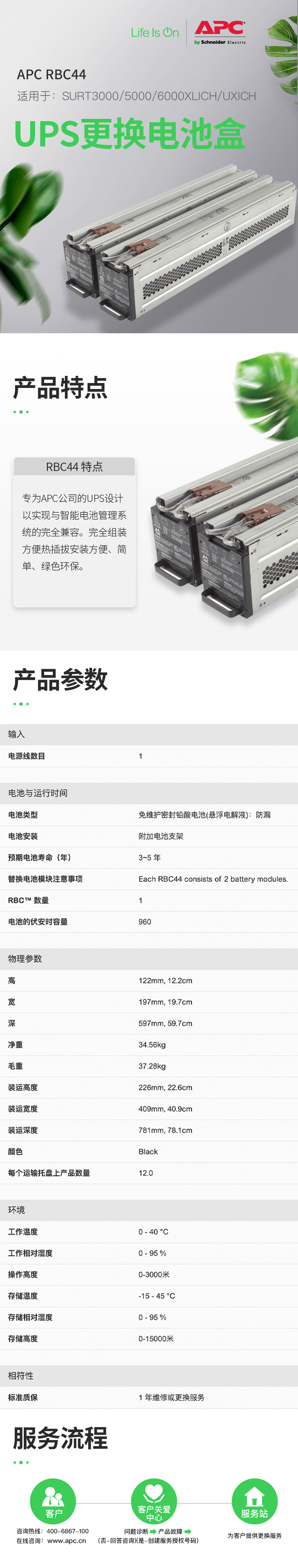 APC RBC44 UPS内置可更换电池包 长寿命 施耐德原厂质保1年